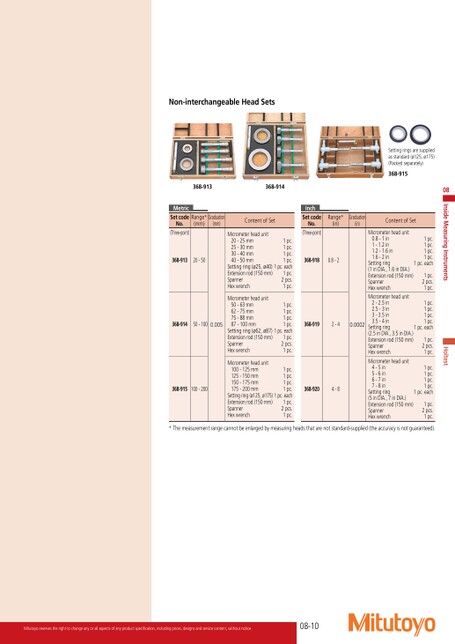 Settingringsaresuppliedasstandard(ø125,ø175)(Packedseparately)368-915Range*(in)Graduation(in)ContentofSetInchSetcodeNo.(Three-point)Holtest1pc.1pc.1pc.1pc.1pc.each1pc.2pcs.1pc.1pc.1pc.1pc.1pc.1pc.each1pc.2pcs.1pc.1pc.1pc.1pc.1pc.1pc.each1pc.2pcs.1pc.Micrometerheadunit0.8-1in1-1.2in1.2-1.6in1.6-2inSettingring(1inDIA.,1.6inDIA.)Extensionrod(150mm)SpannerHexwrenchMicrometerheadunit2-2.5in2.5-3in3-3.5in3.5-4inSettingring(2.5inDIA.,3.5inDIA.)Extensionrod(150mm)SpannerHexwrenchMicrometerheadunit4-5in5-6in6-7in7-8inSettingring(5inDIA.,7inDIA.)Extensionrod(150mm)SpannerHexwrench368-9180.8-2368-9192-40.0002368-9204-8Non-interchangeableHeadSets368-913368-914MetricSetcodeNo.(Three-point)Range*Graduation(mm)(mm)368-91320-50368-91450-1000.005368-915100-200ContentofSetMicrometerheadunit20-25mm25-30mm30-40mm40-50mmSettingring(ø25,ø40)Extensionrod(150mm)SpannerHexwrench1pc.1pc.1pc.1pc.1pc.each1pc.2pcs.1pc.Micrometerheadunit50-63mm62-75mm75-88mm87-100mmSettingring(ø62,ø87)Extensionrod(150mm)SpannerHexwrench1pc.1pc.1pc.1pc.1pc.each1pc.2pcs.1pc.Micrometerheadunit100-125mm125-150mm150-175mm175-200mmSettingring(ø125,ø175)Extensionrod(150mm)SpannerHexwrench1pc.1pc.1pc.1pc.1pc.each1pc.2pcs.1pc.*Themeasurementrangecannotbeenlargedbymeasuringheadsthatarenotstandard-supplied(theaccuracyisnotguaranteed).08-10