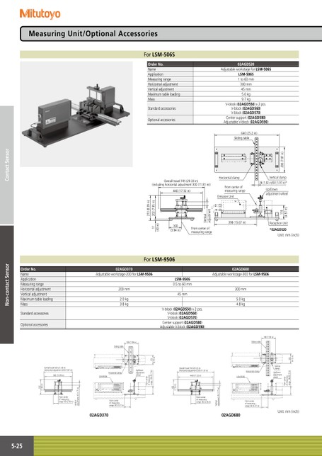 200(7.87in)02AGD520AdjustableworkstageforLSM-506SLSM-506S1to60mm300mm45mm5.0kg9.7kgV-block(02AGD550)x2pcs.V-block(02AGD560)V-block(02AGD570)Centersupport(02AGD580)AdjustableV-block(02AGD590)640(25.2in)SlidingtableForLSM-506SOrderNo.NameApplicationMeasuringrangeHorizontaladjustmentVerticaladjustmentMaximumtableloadingMassStandardaccessoriesOptionalaccessoriesUnit:mm(inch)(4.57in)116ReceptionUnit*02AGD520398(15.67in)HorizontalclampFromcenterofmeasuringrangeEmissionUnitVerticalclamp26(1.02in)/50(1.97in)*Up/DownadjustmentwheelOveralltravel745(29.33in)(includinghorizontaladjustment300(11.81in))440(17.32in)adjustmentVertical202(7.95in)213(8.39in)Fromcenterofmeasuringrange100(3.94in)(43in)11ForLSM-9506180(7.09in)SlidigtablMeasuringUnit/OptionalAccessories02AGD370Adjustableworkstage-200forLSM-950602AGD680Adjustableworkstage-300forLSM-9506LSM(4.72in)120range:106(4.17in)ofmeasurngFromcenterUp/Downadjstmentwheel300mmHoriontalclampLSM-95065.0kg4.8kgFromcenterofmeasuringrange:83(3.27i)180(7.09in)SlidigtableLSM-95060.5to60mmOveralltravel545(21.46in)(oriontaladjustment200(7.87in))45mm340(13.39in)(7.56in)192adjustment45(1.77in)VerticalFromcenterofmeasurigrange:60(2.36in)V-block(02AGD550)x2pcs.V-block(02AGD560)V-block(02AGD570)Centersupport(02AGD580)AdjustableV-block(02AGD590)200mm2.0kg3.8kg180(7.09in)SlidigtableOrderNo.NameApplicationMeasuringrangeHorizontaladjustmentVerticaladjustmentMaximumtableloadingMassStandardaccessoriesOptionalaccessoriesLSM-9506用アジャスタブルワークステージ-200本体部LSM(4.72in)120range:106(4.17in)ofmeasuringFromcenterVerticalclampUp/DownadjstmentwheelFromcenterofmeasuringrange:83(3.27in)02AGD680Unit:mm(inch)adjustment:45(1.77in)VertcalFromcenterofmeasuringrange:60(2.36i)(7.56in)192LSM-9506用アジャスタブルワークステージ-300本体部(472in)120range:106(4.17in)ofmeasuringFromcenterUp/Downadjustmentwheel(4.72in)120.17in)HoriontalclampVerticalclampUp/DownadjustmentFromcenterofmeasuringrange:83(3.27i)02AGD370180(7.09i)Slidingtableadustment:45(1.77in)VerticaFromcenterofmeasurigrange:60(2.36in)(7.56in1925-25Overalltravel745(29.33in)(Horizontaladjustment300(11.81i)Overaltravel545(21.46in)(Horizontaladjustment200(7.87in))340(13.39in)HoriontalclampLSM-9506Overalltravel745(29.33in)(Horizontaladjustment300(1.81i)440(17.32in)HorizontalclmpLSM-9506