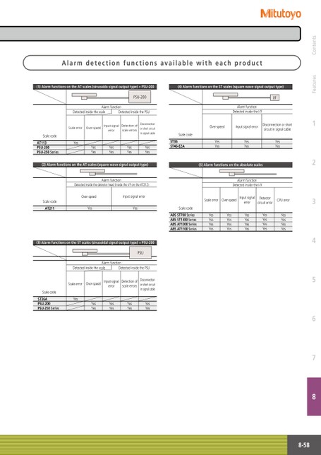 AlarmdetectionfunctionsavailablewitheachproductPSU-200PSU(1)AlarmfunctionsontheATscales(sinusoidasignaloutputtype)+PSU-200(4)AlarmfunctionsontheSTscales(squarewavesignaloutputtype)PSU-200AlarmfunctionDetectedinsidethescaleDetectedinsidethePSUScaleerrorOver-speedInputsignalerrorDetectionofscaleerrorsDisconnectionorshortcircuitinsignalcableYesYesYesYesYesYesYesPSUPSU-200YesYesI/FAlarmfunctionDetectedinsidetheI/FScalecodeST36ST46-EZAOver-speedInputsignalerrorDisconnectionorshortcircuitinsignalcableYesYesYesYesYesYesPSU-200ScalecodeAT113PSU-200PSU-250Series(2)AlarmfunctionsontheATscales(squarewavesignaloutputtype)(5)AlarmfunctionsontheabsolutescalesI/FAlarmfunctionDetectedinsidethedetectorhead(insidetheI/FontheAT212)Over-speedInputsignalerrorPSUScalecodeAT211YesPSU-200YesI/F(3)AlarmfunctionsontheSTscales(sinusoidalsignaloutputtype)+PSU-200PSUAlarmfunctionDetectedinsidethescaleDetectedinsidethePSUAlarmfunctionDetectedinsidetheI/FScaleerrorOver-speedInputsignalerrorDetectorcircuiterrorPSUCPUerrorScalecodeABSST700SeriesABSST1300SeriesABSAT1300SeriesABSAT1100SeriesYesYesYesYesYesYesYesYesYesYesYesYesYesYesYesYesI/FYesYesYesYesScalecodeST36APSU-200PSU-250SeriesYesScaleerrorOver-speedInputsignalerrorI/FDetectionofscaleerrorsDisconnectionorshortcircuitinsignalcableYesYesYesYesYesYesYesYes8-58